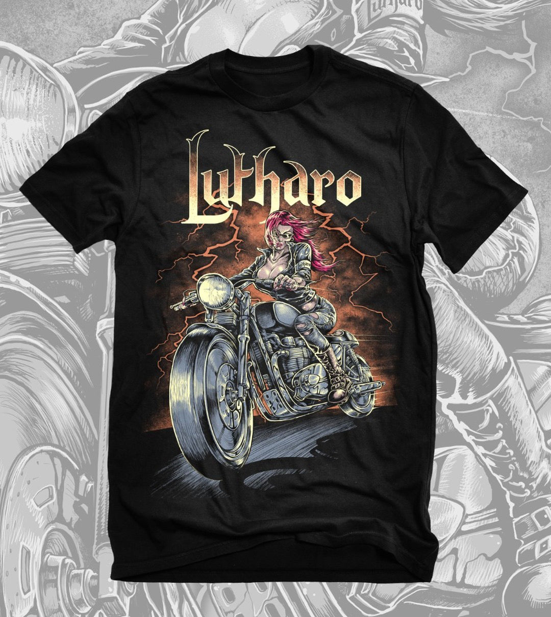 Lutharo "Born To Ride" two-sided black t-shirt. The "Born To Ride" biker lady design printed on the front and the "Born To Ride" text with the Lutharo logo printed on the back.